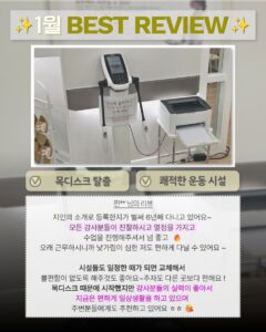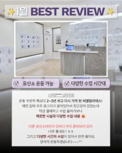 지인의 소개로 등록한 지 벌써 6년째 다니고 있어요! 모든 강사분들이 친절하시고 열정을 가지고 수업을 진행해주셔서 너무 좋고 🔥 오래 근무하시니까 낯가림이 심한 저도 편하게 다닐 수 있어요. 시설도 일정한 시기에 교체해서 불편함이 없도록 해주는 점도 좋고, 주차도 다른 곳보다 편해요. 목디스크 때문에 시작했지만 강사분들의 실력이 좋아서 지금은 편하게 일상생활을 하고 있으며, 주변 분들에게도 추천하고 있어요.