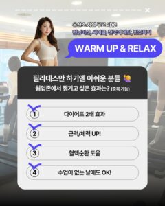 수업 전후로 이용 가능한 웜업존 + 릴렉스존 유산소 기구도 준비되어 있습니다. 수업이 없는 날에도 이용 가능하며 런닝머신, 싸이클, 천국의 계단을 통해 필라테스와 유산소 운동을 함께 병행하면 다이어트 효과도 더욱 높일 수 있습니다.